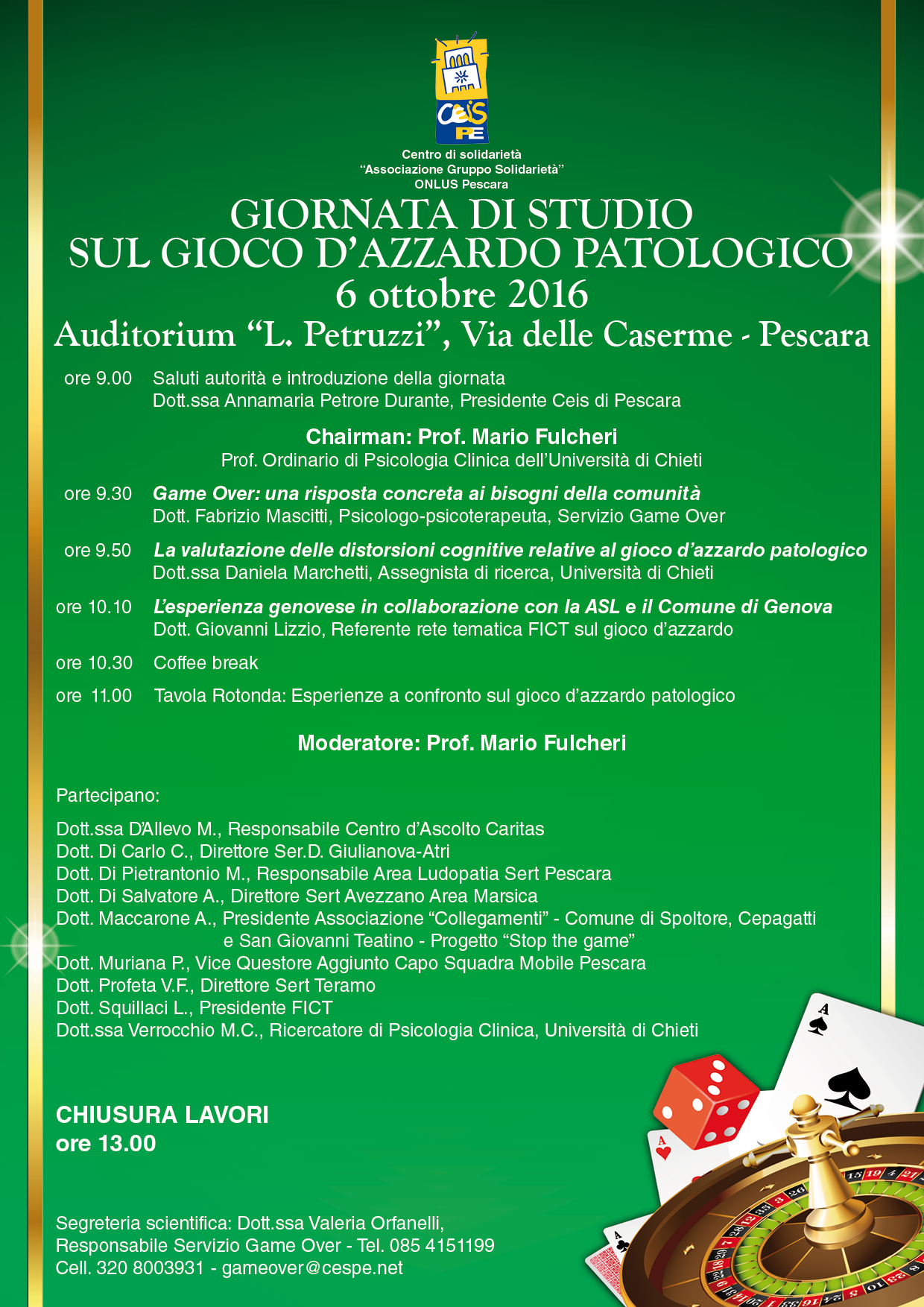 Giornata di studio sul gioco d’azzardo patologico a Pescara. Iniziativa organizzata dal Ceis di Anna Durante.