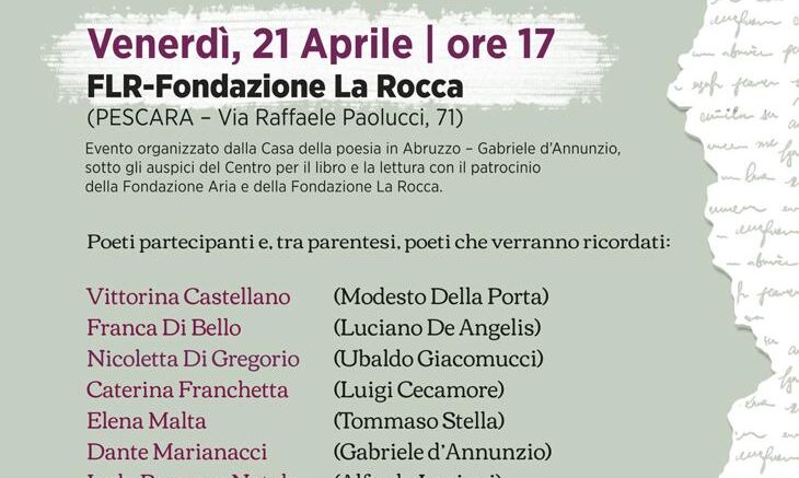 L’evento ha inizio oggi pomeriggio alle ore 17 nelle sede della Fondazione La Rocca di Via Raffaele Paolucci. La serata è stata ideata e viene condotta dal presidente della Casa della poesia in Abruzzo – Gabriele d’Annunzio e della Fondazione Aria Dante Marianacci, sotto gli auspici del Centro per il libro e la lettura, e con il patrocinio della Fondazione Aria e della Fondazione La Rocca, presieduta da Ottorino La Rocca. Ciascun poeta partecipante leggerà una breve poesia di un poeta abruzzese scomparso, da d’Annunzio ai giorni nostri, commemorandolo brevemente, anche attraverso il libro dal quale la poesia è tratta; poi leggerà un proprio componimento in omaggio al poeta che verrà ricordato.