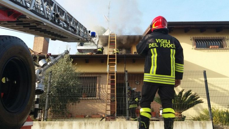 I vigili del fuoco del distaccamento di Roseto degli Abruzzi, con due un’autopompe e il supporto di un’autobotte del Comando di Teramo, è intervenuta in via Dello Splendore a Giulianova, per l’incendio del tetto ventilato di una villetta. L’incendio si è innescato a causa delle fiamme sviluppate da un camino. I vigili del fuoco hanno raggiunto il tetto dell’edificio ed hanno spento l’incendio, limitando a 50 metri quadrati la superficie della copertura bruciata. Per spegnere l’incendio i vigili hanno utilizzato anche una motosega, servita per tagliare parte della copertura in legno e raggiungere tutti i punti in cui le fiamme covavano, riuscendo ad estinguerle completamente. Per spegnere l’incendio i vigili del fuoco hanno impiegato anche un furgone aria, per il rifornimento delle bombole di aria compressa per gli autorespiratori, utilizzati per operare in presenza di denso fumo. I locali dell’abitazione sottostante, adibiti a zona giorno, sono rimasti danneggiati dal fumo sprigionato dall’incendio e dall’acqua di spegnimento e saranno stati resi inagibili. Al momento sono in corso le operazioni di smassamento e rimozione delle parti della copertura parzialmente bruciate.
