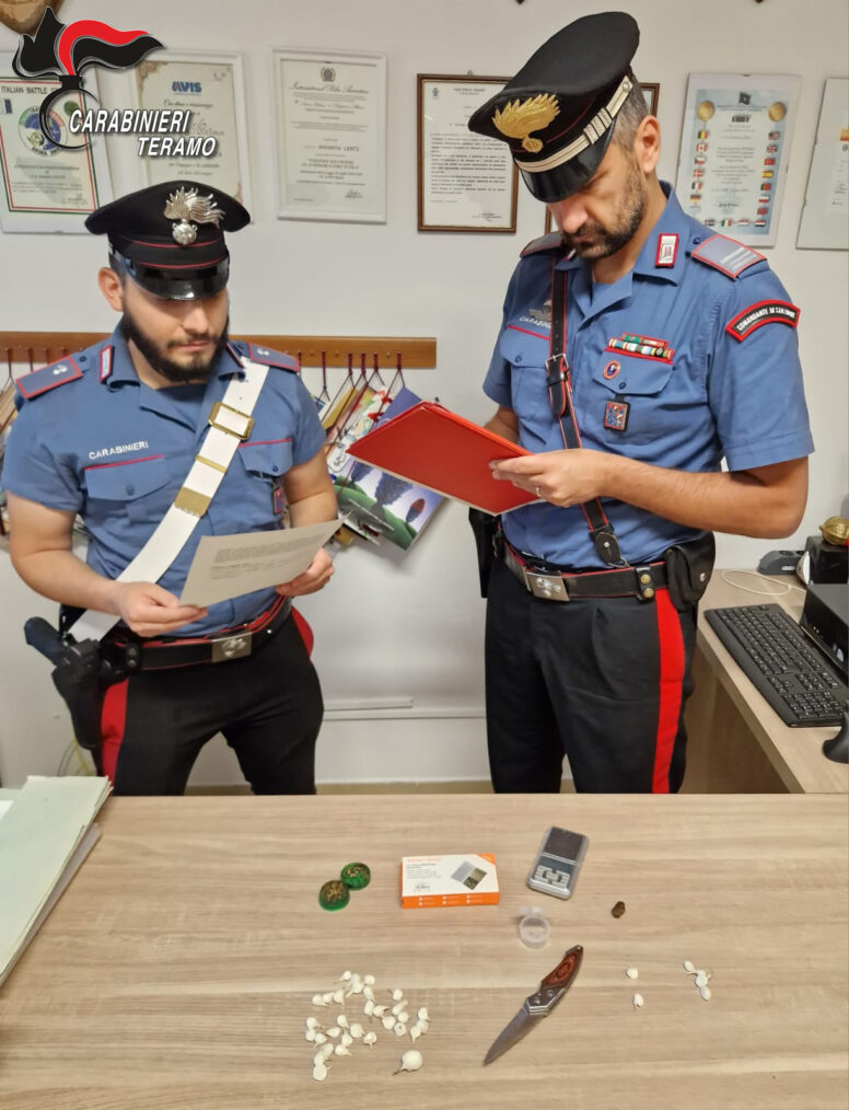 -Pineto (TE) è stato arrestato un uomo per spaccio di stupefacenti. I Militari della locale stazione vigilando sugli esercizi commerciali al fine di prevenire eventuali reati predatori nei confronti degli stessi, notavano un dipendente di un locale supermercato che usciva dall’esercizio e con fare guardingo consegnava un piccolo involucro a un giovane che subito si dileguava facendo perdere le proprie tracce. I militari approfondivano il controllo e sottoponevano il commesso a una perquisizione personale che permetteva di rinvenire, occultati nelle parti intime nr. 6 involucri di sostanza stupefacente del tipo “cocaina”. La perquisizione estesa all’abitazione dell’uomo permetteva di rinvenire altre ulteriori 31 dosi della medesima sostanza nonché materiale per il confezionamento della stessa, per un peso complessivo di quasi 20 grammi.