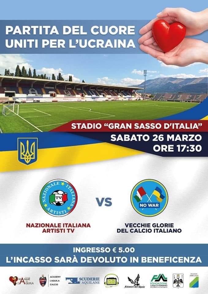 L’Aquila Calcio con la sua Academy, Mamme per L’Aquila e altri partner domani saranno in campo per sostenere la popolazione Ucraina in fuga dalla guerra. Alle 17.30 allo stadio Gran Sasso si sfideranno la nazionale artisti e le vecchie glorie del calcio Italiano.