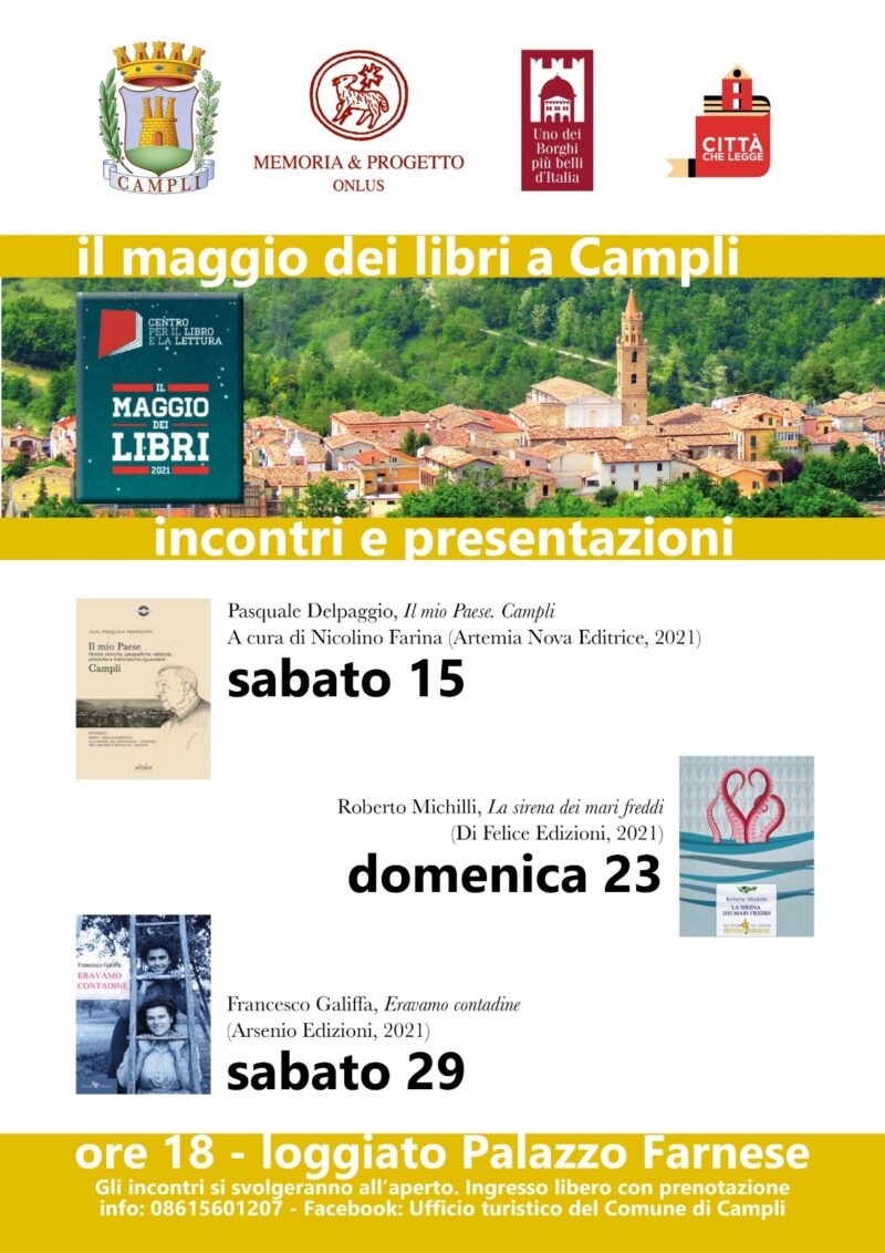 A Campli, uno dei borghi più belli d’Italia, sono previste tre presentazioni all’aperto, nel loggiato di Palazzo Farnese, nell’ambito dell’iniziativa “Maggio dei libri”.
