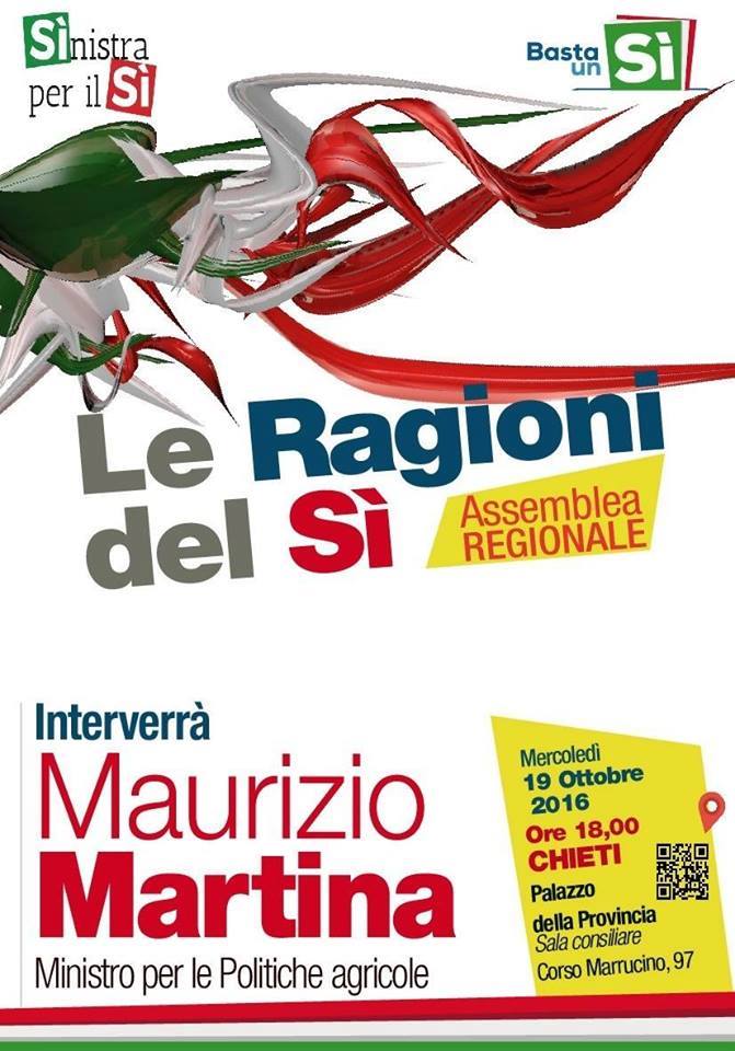 Il ministro per le politiche agricole Maurizio Martina domani pomeriggio sarà a Chieti per partecipare ad una manifestazione sul referendum costituzionale del prossimo 4 dicembre. Un’assemblea in programma , alle ore 18 nella sala consiliare della Provincia per sostenere le ragioni del si al referendum .
