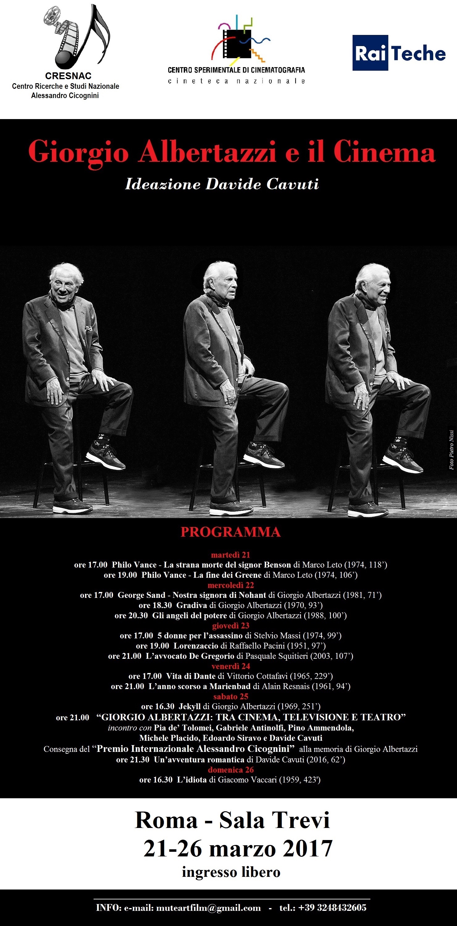 La rassegna è ideata e curata da Davide Cavuti in colalborazione con Teche Rai, Centro Sperimentale di Cinematografia – Scuola Nazionale di Cinema – Cineteca Nazionale di Roma e il CRESNAC. Nella serata di sabato 25 marzo, alle ore 21, si terrà l’incontro dal titolo “Giorgio Albertazzi: tra cinema, televisione e teatro” con la partecipazione di Pia de’ Tolomei, Gabriele Antinolfi, Davide Cavuti, Pino Ammendola, Michele Placido, Edoardo Siravo e la Consegna del “Premio Internazionale Alessandro Cicognini” alla memoria del maestro Giorgio Albertazzi.