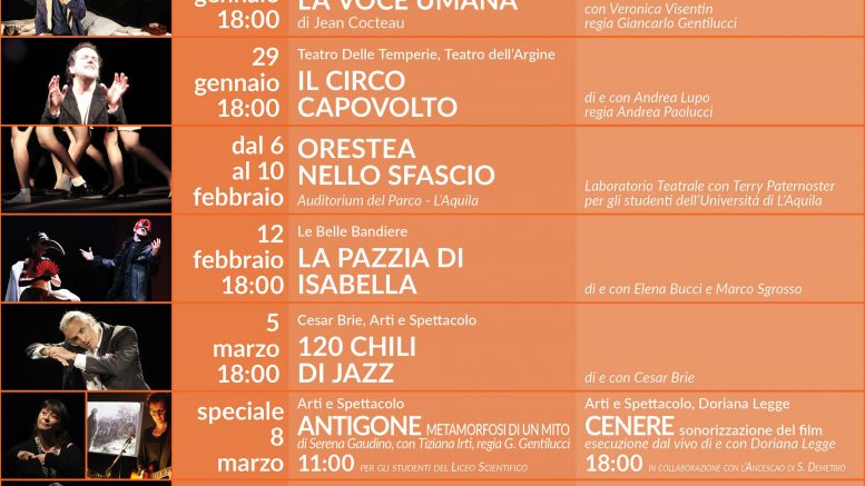 In una nota si legge che “ La nuova stagione prenderà il via il prossimo 15 gennaio, e proseguirà fino al 9 aprile: in ogni appuntamento saliranno sul palco attori emergenti ed affermati, per una rassegna teatrale di qualità, caratteristica da sempre distintiva di Arti e Spettacolo. Anche quest’anno particolare attenzione sarà dedicata alla nuova drammaturgia italiana. Sono inoltre previste collaborazioni con soggetti del territorio, come l’Università degli Studi dell’Aquila – per quanto riguarda il laboratorio con gli studenti – e liceo scientifico “A. Bafile” del capoluogo abruzzese, per ciò che concerne l’appuntamento speciale dell’otto marzo. Ad aprire Strade 2017 ci penserà La voce umana di Jean Cocteau, una produzione Arti e Spettacolo, regia di Giancarlo Gentilucci, con Veronica Visentin. Il 29 gennaio sarà la volta del Circo Capovolto (Teatro delle Temperie – Teatro dell’Argine), mentre dal 6 al 10 febbraio Orestea nello sfascio sarà il titolo del laboratorio teatrale con Terry Paternoster, che si terrà all’Aquila e che sarà dedicato agli studenti e alle studentesse di Univaq. Si torna al Nobelperlapace il 12 febbraio con La pazzia di Isabella – Vita e morte dei comici gelosi, di e con Marco Sgrosso e Elena Bucci (premio Eleonora Duse 2016 come migliore attrice italiana). Marzo si apre con un’altra produzione di Arti e Spettacolo: 120 kg di jazz di e con Cesar Brie, uno dei grandi del teatro mondiale, habitué del Nobelperlapace. A seguire, nella giornata internazionale della donna (8 marzo), sarà raddoppiato l’appuntamento con Strade: la mattina con Antigone – Metamorfosi di un mito, messo in scena all’Aquila per gli studenti del “Bafile” dell’Aquila; nel pomeriggio al Nobelperlapace con Cenere, sonorizzazione dell’omonimo film del 1916 con Eleonora Duse, valorizzato attraverso l’esecuzione musicale dal vivo di Doriana Legge. A tenere banco, il 12 marzo, sarà Qualcosa a cui pensare, commedia romantica del giovane Emanuele Aldrovandi, tra i giovani autori emergenti italiani e vincitore di prestigiosi premi negli ultimi anni. Il 1 aprile si torna all’Aquila, e si scende addirittura in piazza, con il barbonaggio teatrale di Fanculopensiero, di Michele Santeramo, con Ippolito Chiarello: l’artista ha stabilito un prezzo per ogni porzione del suo spettacolo, ha fatto un listino e lo distribuisce al pubblico di passaggio. Il giorno dopo, invece, spazio sul palco del Nobelperlapace a Psyko Killer – Quanto mi dai se ti uccido. Chiusura in bellezza il 9 aprile, con Amoressia – Una storia vera tranne nei punti in cui non lo è (Internoenki), con il testo di un altro giovane autore, Federico Cervigni, anch’egli già premiato in diversi festival e concorsi nazionali. Tanti spettacoli, insomma, per il pubblico attento di Arti e Spettacolo. La rassegna si svolse per la prima volta a Casentino di Sant’Eusanio Forconese (L’Aquila), nel teatro La Scuola, nell’estate del 2008. Con gli anni è cresciuta nel Nobelperlapace di San Demetrio, attraversato da tantissime persone avvicinatesi al teatro per la prima volta, in un comprensorio – quello dell’Abruzzo interno aquilano – non facile per caratteristiche demografiche, sociali ed economiche, ed in una situazione come noto complicata dal terremoto di otto anni fa. Anche nella stagione alle porte la fruizione degli spettacoli è accompagnata dal progetto “L’arte dello spettatore”, volto a stimolare un incontro con gli artisti e una visione più attenta e critica degli spettacoli. Infatti, dopo questi ultimi Arti e Spettacolo organizza degli incontri informali in forma di “aperitivi artistici” con semplici prodotti locali, che permettono agli spettatori di scambiare tra di loro e con gli artisti le impressioni sullo spettacolo. Viene inoltre fornita loro una “scheda guida all’attività recensiva” che può essere utilizzata per scrivere una recensione, di cui una selezione è pubblicata sul web e nella bacheca dello spettatore in teatro “.