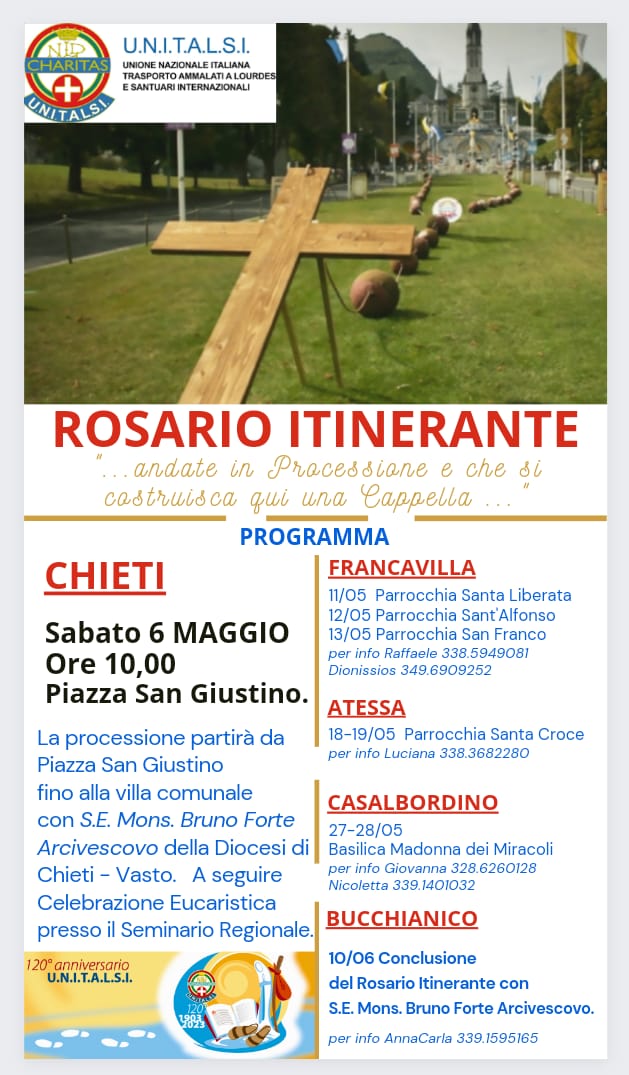 La sottosezione di Chieti-Vasto dell’Unitalsi, da oggi 6 maggio al 13 giugno, è in preghiera per la Pace con il Rosario più grande del mondo realizzato nel 2012 dai giovani volontari abruzzesi dell’Unitalsi nella parrocchia di San Francesco Caracciolo di Chieti insieme a decine di volontari unitalsiani giunti da ogni parte d’Abruzzo. Le tappe sono cinque: Chieti, Francavilla al Mare, Atessa, Casalbordino e Bucchianico.