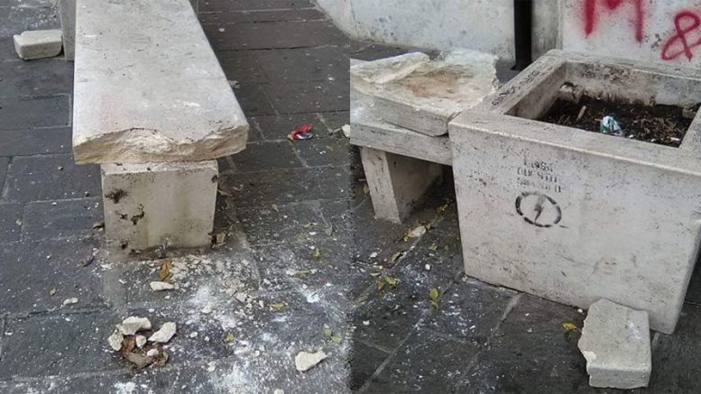 Mastelli e cestini per i rifiuti distrutti e gettati a terra, arredo urbano completamente devastato in una notte di assurda follia tra Piazza Risorgimento e strade limitrofe ad Avezzano.