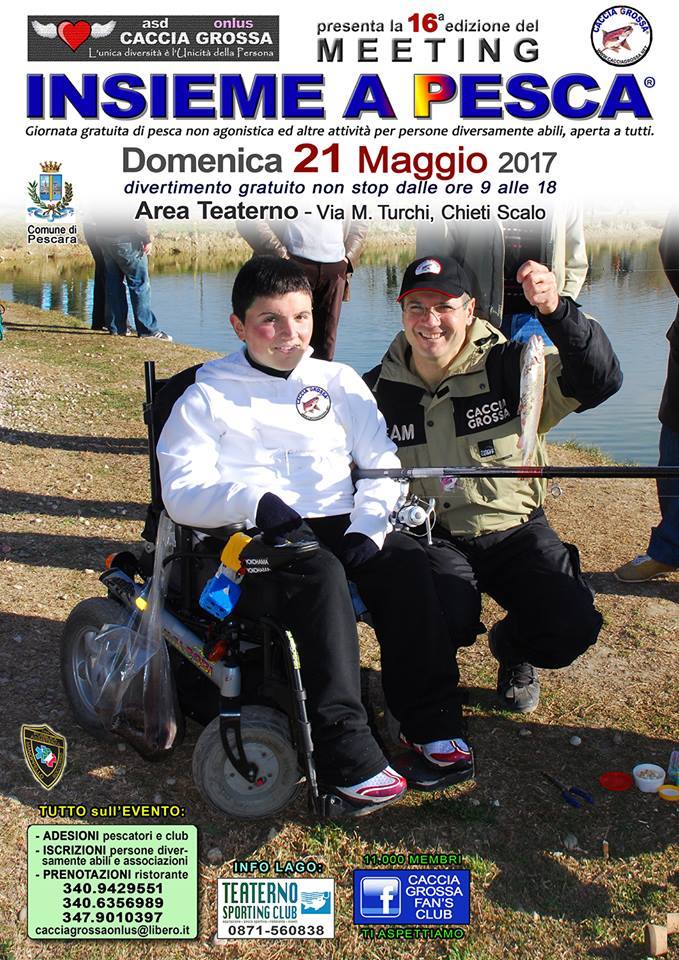 Domenica 21 Maggio dalle ore 9 presso il Lago Teaterno di Chieti Scalo l’ASD Caccia Grossa Onlus di Pescara, presieduta da Daniele Di Girolamo, organizza la sedicesima edizione del Meeting “Insieme a Pesca”, alla quale si può iscrivere gratuitamente qualsiasi persona diversamente abile. L’Evento ha lo scopo di affermare sul campo l’idea dell’ Integrazione sociale “No Limits”, ovvero “nessuno escluso”. Il ricco programma prevede: gadget, pesca in lago alla carpa, pranzo con animazione musicale, tiro a segno Soft Air, tiro con l’arco, basket facilitato, contatto con uccelli rapaci, cagnolini e cavallo, pesca in vasca alla trota gigante e molto altro, in quello che rappresenta un grande parco giochi per la diversabilità abruzzese e non solo. Per prenotazioni e INFO 3409429551, email cacciagrossaonlus@libero.it e gruppo Facebook “Caccia Grossa fan’s club”.