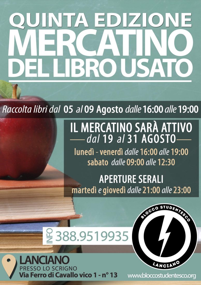 A Lanciano, dal 5 al 9 agosto, dalle ore 16 alle ore 19, nella sede del Blocco Studentesco, movimento studentesco di CasaPound Italia, si terrà la quinta edizione del mercatino dei libri usati. Gli organizzatori fanno sapere che coloro che desiderano vendere libri possono depositarli preventivamente così da garantire già dal primo giorno di apertura del mercatino una vasta scelta di libri di testo.