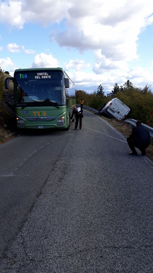 Un autobus della società Tua Spa, in servizio sulla tratta Castel del Monte – L’Aquila, ieri mattina, è rimasto coinvolto in un incidente stradale avvenuto tra Calascio e Santo Stefano di Sessanio. Il bus, sul quale viaggiavano l’autista e tre passeggeri , intorno alle ore 13:30, è stato urtato da un mezzo Ducato sulla Strada Provinciale 7. L’autista di Tua Spa, dopo aver accertato che i passeggeri non avevano necessità di cure, ha prestato soccorso al conducente del mezzo Ducato che era finito in una scarpata ed ha chiamato il 118. Il conducente del veicolo è stato recuperato, assicurato in barella e sollevato sull’eliambulanza con il verricello e poi trasportato in ospedale. Sul luogo dell’incidente sono intervenuti i vigili del fuoco de L’Aquila e i carabinieri di Castel del Monte e Calascio.