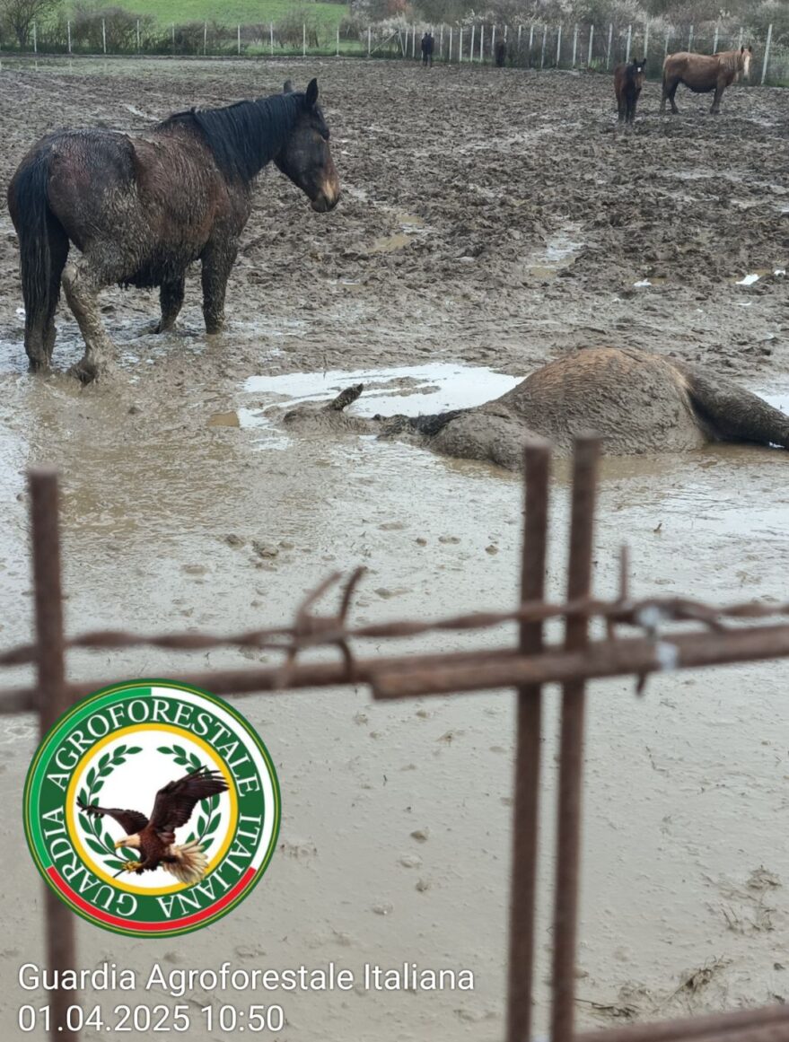 Durante il blitz sono arrivati anche i vigili urbani e la guardia agroforestale Odv Ets che ha trovato – come si legge in una nota documentata da foto – cavalli in mezzo al fango senza cibo e un cavallo morto con carcasse di animali in un sito vicino. “Cosa denunciata – fanno sapere le associazioni – anche alla Asl e all’autorità competente”.
