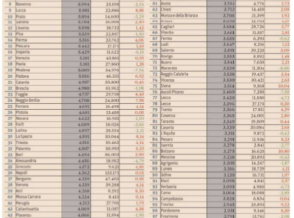 la classifica tiene conto dei reati denunciati in rapporto alla popolazione (ogni 100.000 abitanti) con il numero dei reati rilevati in ciascuna città e la variazione rispetto ai rilevamenti del 2012 e del 2011. In Abruzzo la città per così dire più pericolosa é dunque Pescara al 15° posto con un 1,53% in più di reati rispetto ai precedenti rilevamenti. per trovare un’altra città abruzzese bisogna scendere al 52° posto dove troviamo Teramo con un -9,17% rispetto al 2012. Dieci posizioni più in basso c’é Chieti al 62° posto con +2,05% anche se qui i reati restano sotto il tetto dei tremila. Ultima città abruzzese in classifica e dunque più sicura L’Aquila all’83° posto con un -0,42% di reati rispetto ai precedenti rilevamenti. Curiosità, la città più criminale d’Italia, a sorpresa é Milano, mentre molte città del sud, proverbialmente a rischio, stazionano ben oltre la ventesima posizione: Palermo, ad esempio, 32esima e Napoli, addirittura, 36esima, mentre la città più sicura d’Italia é Matera.