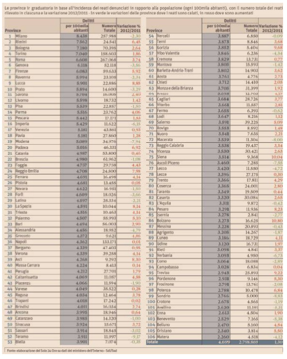 la classifica tiene conto dei reati denunciati in rapporto alla popolazione (ogni 100.000 abitanti) con il numero dei reati rilevati in ciascuna città e la variazione rispetto ai rilevamenti del 2012 e del 2011. In Abruzzo la città per così dire più pericolosa é dunque Pescara al 15° posto con un 1,53% in più di reati rispetto ai precedenti rilevamenti. per trovare un’altra città abruzzese bisogna scendere al 52° posto dove troviamo Teramo con un -9,17% rispetto al 2012. Dieci posizioni più in basso c’é Chieti al 62° posto con +2,05% anche se qui i reati restano sotto il tetto dei tremila. Ultima città abruzzese in classifica e dunque più sicura L’Aquila all’83° posto con un -0,42% di reati rispetto ai precedenti rilevamenti. Curiosità, la città più criminale d’Italia, a sorpresa é Milano, mentre molte città del sud, proverbialmente a rischio, stazionano ben oltre la ventesima posizione: Palermo, ad esempio, 32esima e Napoli, addirittura, 36esima, mentre la città più sicura d’Italia é Matera.