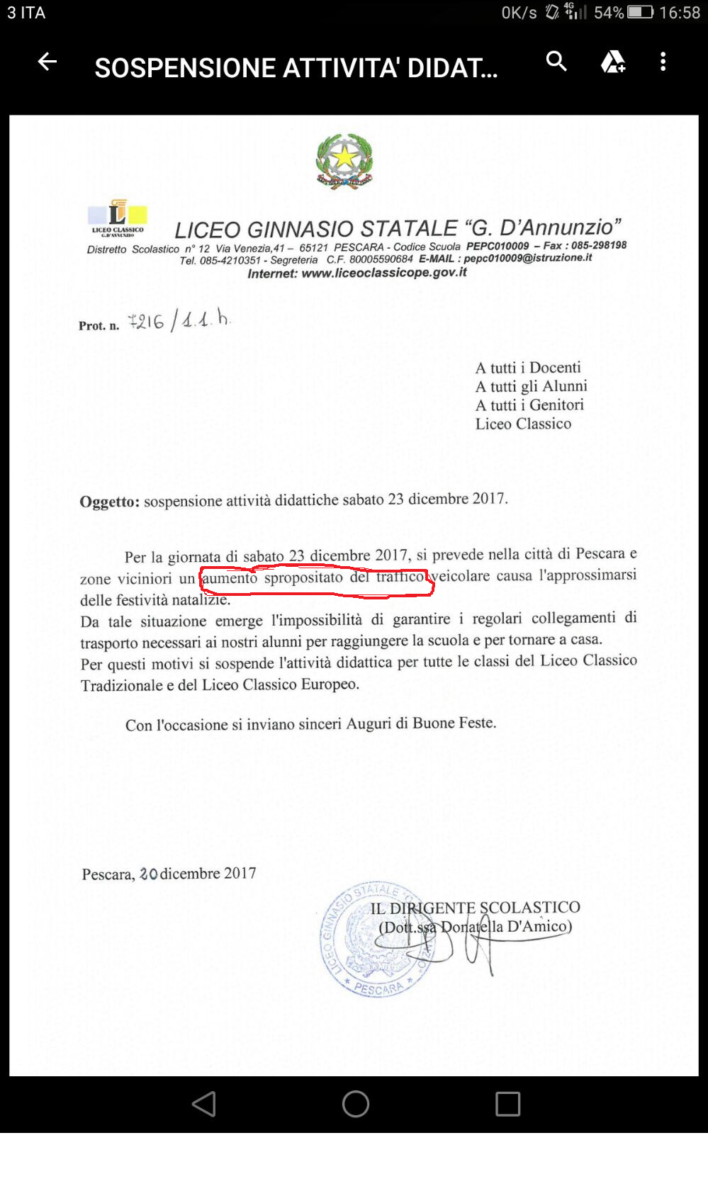L’ultimo in ordine di tempo un dispositivo di mercoledì 20 dicembre nel quale si comunica che la scuola sarà chiusa sabato 23 dicembre anche per le classi del Liceo Classico Tradizionale e del Liceo Classico Europeo per via di un “aumento spropositato dei traffico veicolare – recita la circolare – causa l’approssimarsi delle festività natalizie. Da tale situazione emerge l’impossibilità di garantire il regolare collegamento di trasporto necessario ai nostri alunni per raggiungere la scuola e per tornare a casa”. I rappresentati degli studenti ed anche diversi rappresentanti dei genitori temono che, dietro questo provvedimento, ci sia il tentativo di ostacolare una protesta che da giorni sta montando a causa di ulteriori questioni emerse nello scorso Consiglio d’Istituto, tanto da negare l’autorizzazione ad una mobilitazione pacifica di protesta che gli studenti, sotto la minaccia di interventi da parte delle Forze dell’Ordine e addirittura conseguenze penali, sono stati costretti a svolgere sulle scalinate esterne alla scuola al freddo. A segnare una profonda spaccatura tra la dirigente scolastica, la Prof. Donatella D’Amico, e la stragrande maggioranza del corpo studentesco, oltre all’introduzione della Settimana Corta che, a detta di molti fa già registrare, dopo pochi mesi, un bilancio estremamente negativo, le recenti disposizioni in merito al cosiddetto contributo volontario che per definizione deve ritenersi facoltativo, ma che, in caso di mancato pagamento, andrebbe a negare agli studenti alcuni servizi basilari, come il libretto delle giustificazioni o il divieto a partecipare a gite scolastiche. I rappresentanti degli studenti fanno sapere che la mobilitazione proseguirà e che non é esclusa, al rientro dalle vacanze natalizie, l’occupazione dell’Istituto. E nel tardo pomeriggio è stato raggiunto un accordo tra gli studenti e la dirigente scolastica che domani concederà lo svolgimento di un’assemblea senza contarla come assenza e dopo le vacanze concederà uno spazio per poter continuare la discussione.