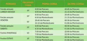 Dal lunedì al giovedì l’ultima corsa da Pescara è prevista alle 20.45 e da Montesilvano alle 21.15 il venerdì e il sabato alle 00.30 e all’ 01.00.