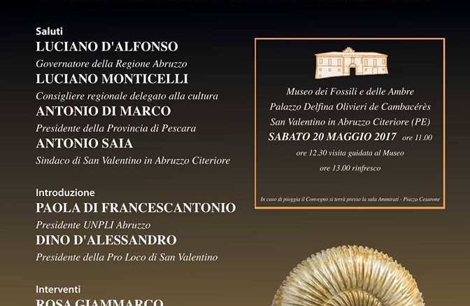 “I piccoli musei tra nuova cultura gestionale e valorizzazione del territorio” è il tema del convegno,organizzato dall’Unpli Abruzzo, in programma sabato 20 maggio,alle ore 11, a San Valentino in Abruzzo Citeriore. E’ prevista la partecipazione del governatore Luciano D’Alfonso, del consigliere regionale delegato alla cultura Luciano Monticelli, del presidente della Provincia di Pescara Antonio Di Marco, del sindaco di San Valentino Antonio Saia. La presidente dell’Unpli Abruzzo Paola Di Francescantonio, che ha fortemente voluto l’evento, introdurrà i lavori assieme al presidente della Pro Loco di San Valentino Dino D’Alessandro. Il punto sulla situazione dei piccoli musei in Abruzzo sarà illustrato dal presidente dell’Associazione Amici del Museo dei Fossili e delle Ambre Beniamino Gigante e da Rosa Giammarco, già Direttrice del Centro Regionale Beni Culturali. Modera il convegno il consigliere regionale dell’Unpli Abruzzo Loris Di Giovanni. Saranno, inoltre, presenti sindaci e direttori di musei, i presidenti delle Pro Loco e delle associazioni che si occupano di cultura e turismo sul territorio. Seguirà una visita guidata alla collezione del museo, ospitato da Villa Olivieri de Cambacérès, che è stato istituito nel gennaio 2004. Al suo interno si trova una vasta raccolta di fossili sulla storia degli ultimi 500 milioni di anni del pianeta ed una preziosa raccolta di ambre studiate sia dal punto di vista paleontologico, sia da quello di utilizzazione da parte dell’uomo. Il Museo è articolato in due sale: la Sala Paleontologica, che comprende la sezione fossili e la sezione “uomo” e la Sala delle Ambre.
