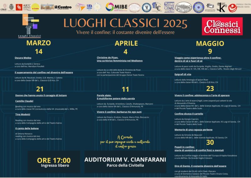 Confine e divenire dell’essere in una correlazione dinamica aprono un interessante campo di ricerca, per l’edizione 2025 di Luoghi Classici, Rassegna di Letture pubbliche ad alta voce di Classici antichi, moderni e contemporanei, a Chieti