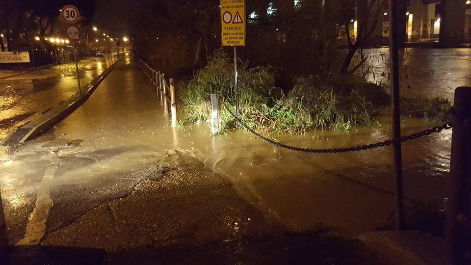 Dopo l’emergenza neve, a Pescara ora é allarme alluvione a causa della pioggia che cade incessantemente da quasi 12 ore. Il fiume ha iniziato ad esondare alle 5 circa, le golene sono state chiuse già alle 4,30 quando si sono accesi i semafori segnalando la situazione di allarme. Problemi di allagamenti si registrano in tutto il territorio comunale, su cui la Protezione Civile comunale, in sinergia con Polizia Municipale e forze dell’ordine sta operando per cercare di uscire dalla fase di emergenza. Si raccomanda la massima prudenza e di prendere l’auto soltanto se necessario: le strade allagate non consentono di avere una perfetta cognizione dell’eventuale pericolo e il passaggio delle auto potrebbe peggiorare la situazione allagamento alle strutture circostanti. Segnalato uno smottamento nella zona di Colle Scorrano.