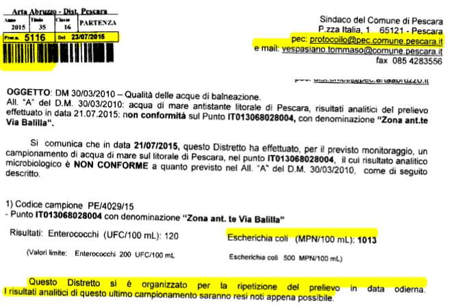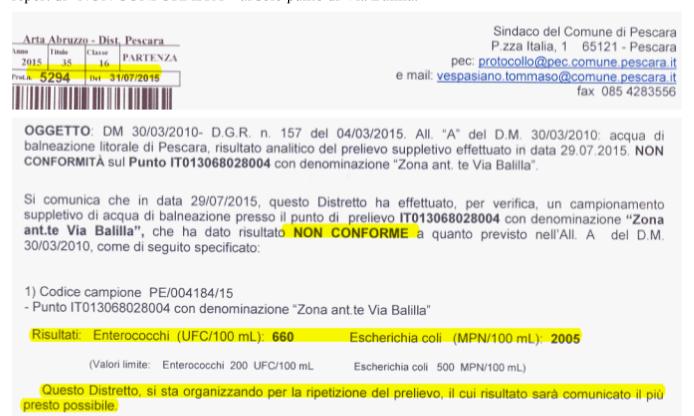 Circostanza che viene portata anche alla mia conoscibilità dal Dirigente comunale, Arch. Vespasiano, con una telefonata dello stesso giorno, 23 luglio alle ore 19:44. Una situazione di potenziale allarme per la tutela della salute dei cittadini che risultava essere già venuta meno poiché l’ARTA nella prime ore di quella stessa giornata del 23 luglio ha proceduto a svolgere nuove analisi che hanno dato esito di “CONFORMITA’” alla balneazione e con valori bassissimi, e quindi nessun atto di irresponsabilità è stato tenuto da chi aveva la responsabilità di adottare provvedimenti in simili circostanze.