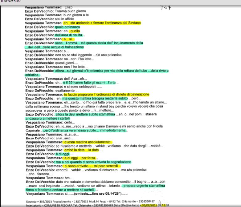 A quella data ed a quell’ora e con quei dati risalenti al 31 luglio era logico constatare, da parte mia, come il sabato e domenica 1 e 2 agosto le acque del mare non fossero conformi e quindi le persone che erano andate al mare nel tratto di Via Balilla avevano fatto il bagno in acque non balneabili. Considerazioni, le mie, che venivano smentite con la conoscenza delle ulteriori analisi svolte dall’ARTA nelle prime ore di sabato 1° agosto e che avevano dato esito di “CONFORMITA’” e quindi il sabato e domenica 1 e 2 agosto chi aveva fatto il bagno nel mare di Pescara lo aveva fatto in acque balneabili. Maldestramente, stando alla lettura dei giornali di questi giorni, nella conversazione telefonica (intercettata) con il Dirigente Vespasiano delle ore 09:53 avrei dovuto precisare che il colloquio delle ore 09:13 era da ritenersi non più valido per quella parte. All’esito di tutto questo rimane la responsabilità da parte del Comune di non aver, per una disfunzione tecnico-amministrativa della macchina comunale, assunto iniziative riguardanti la sola giornata del 31 luglio per incolpevole conoscenza del fatto stesso. In attesa del giudizio della magistratura su queste vicende ho ritenuto di dover fornire le mie considerazioni sulla base della lettura completa di tutti gli atti riguardanti la problematica della balneazione del 2015 che fanno inquadrare, come un giornale riportava qualche giorno addietro, nella giusta luce i fatti della scorsa estate.