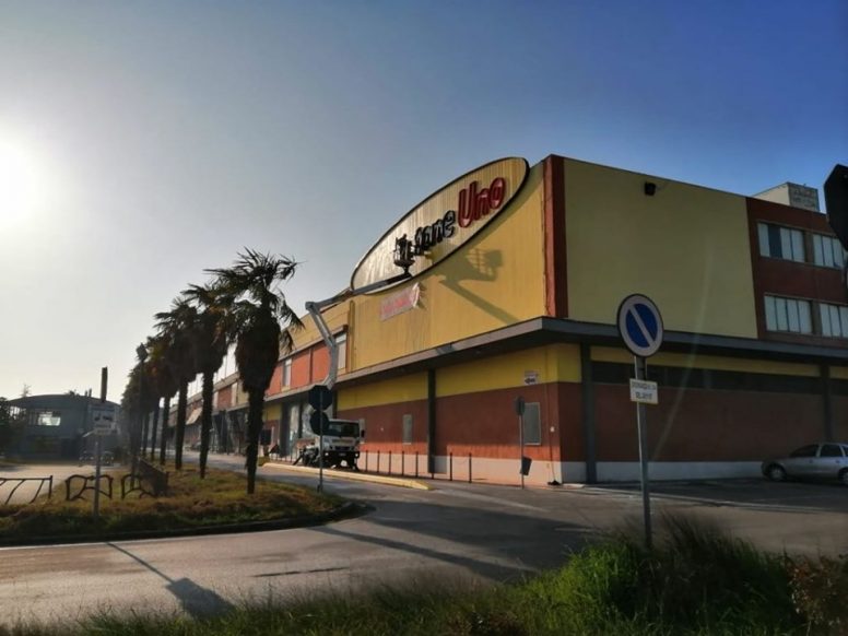 Operai al lavoro questa mattina per rimuovere l’insegna del Mercatone Uno dallo stabilimento di Scerne di Pineto.