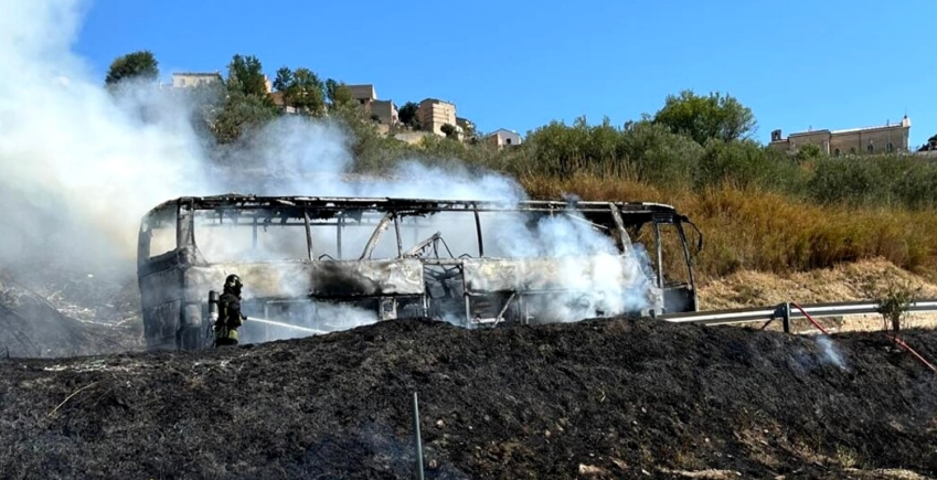 Un autobus è stato completamente distrutto dalle fiamme, questa mattina, a Monteodorisio. Illesi l’autista e i passeggeri