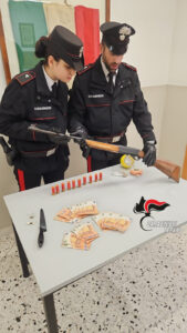 In una seconda abitazione sono state ritrovate alcune dosi di hashish e marijuana e materiale per il taglio ed il confezionamento della droga. In una terza abitazione è stato sequestrato un fucile da caccia calibro 12, detenuto illegalmente che era stato importato clandestinamente in Italia dall’estero. Le banconote, la droga e l’arma da fuoco saranno sottoposte ad ulteriori accertamenti per determinarne la provenienza.