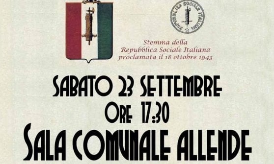 Una giunta del Partito Democratico, una sala dedicata ad uno dei simboli della sinistra mondiale come Salvator Allende, eppure a Nereto, in provincia di Teramo, succede che questa sala del Comune viene concessa a Forza Nuova per ospitare un convegno sulla Repubblica di Salò. Un particolare che non é sfuggito a molti militanti di sinistra, in particolare al collettivo Wu Ming. Nella denuncia si fa anche riferimento alla locandina del convegno, realizzata con i caratteri classici del ventennio con tanto di fascio littorio. La notizia é stata rilanciata su Tweeter e sono già scoppiate le polemiche a livello globale. Anche il quotidiano “La Repubblica” ha pubblicato, sul proprio sito, la notizia parlando anche d’indignazione da parte di quei cittadini di Nereto che hanno votato il centrosinistra.