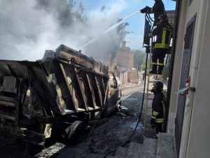 L’incendio del mezzo ha causato danni ad un portone in legno di un garage adiacente alla carreggiata e ad alcuni infissi del piano terra dell’edificio del Comune e ad un lampione della pubblica illuminazione.