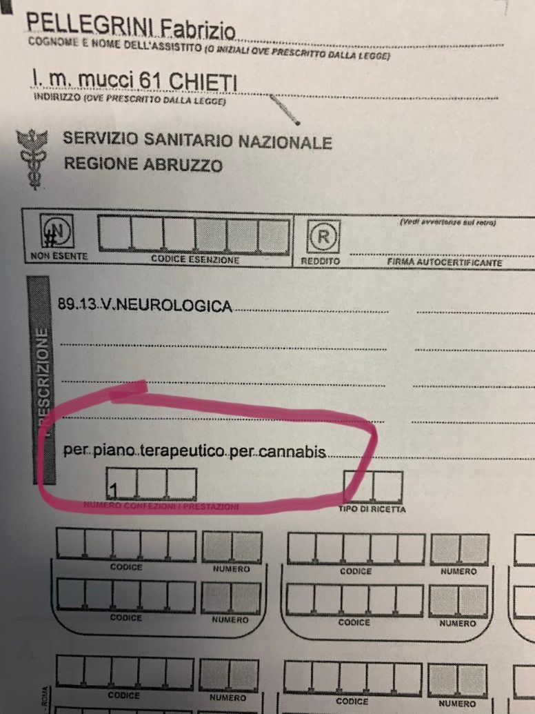 Tuttavia lo scorso 29 gennaio Pellegrini, con regolare ricetta rossa attestante “visita neurologica per piano terapeutico per cannabis”, firmata dal medico di base la dottoressa Anna Maria Cerulli (che da noi contattata ci ha detto di aver soltanto operato nel rispetto assoluto della legge e su suggerimento di uno specialista), è tornato nuovamente presso l’Asl di Chieti, per richiedere l’erogazione delle necessarie cure mediche. Ma queste gli sono state ancora una volta negate, come specificato nella diffida che il legale Di Nanna ha inviato al Direttore Sanitario della Asl di Chieti lanciano Vasto, e per conoscenza al Presidente della Giunta Regionale Marsilio, alla Giunta Regionale e al Ministero della Salute, in base ad un disarmante “Non sappiamo come fare”. Ma c’è di più, di fronte ad una dichiarata impotenza, gli è stato anche rimborsato il ticket di 30 euro con tanto di pacca sulla spalla e di invito a rivolgersi ad uno studio privato… a spese proprie ovviamente.