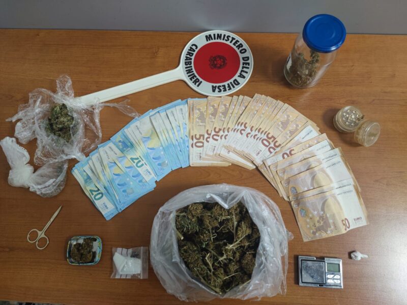 Per il figlio della donna che non era in casa al momento della perquisizione, è scattata la denuncia a piede libero per detenzione di droga ai fini di spaccio e detenzione di banconote contraffatte poichè i 300euro trovati in casa erano nella sua camera da letto.
