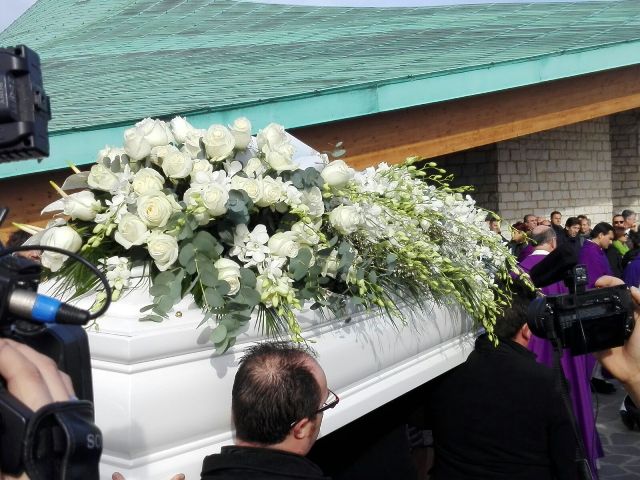 I FUNERALI – La banda di Chieti, con una marcia sinfonica, ha accolto all’arrivo, sul sagrato della chiesa del Sabato Santo a Vasto, la bara bianca di Italo D’Elisa. Nel saluto introduttivo il parroco, don Antonio Totaro, ha ammonito i presenti: “Si fermi questa ondata di odio. Basta con questa violenza. Non si può andare avanti con l’odio. Due vite completamente spezzate. Ha perso la città. Noi abbiamo perso”. Il sacerdote ha portato le condoglianze delle famiglie Di Lello e Smargiassi. “E’ qui presente il fratello di Roberta” ha detto ai presenti. E ancora: “Queste morti riportino nella nostra comunità un po’ di serenità. Basta con i social media. Dobbiamo tornare a parlare tra di noi. Senza conoscere abbiamo condannato” ha aggiunto il parroco. Ai funerali anche una corona della famiglia dell’omicida (Foto in basso)