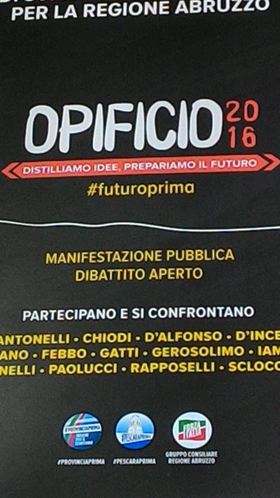 Opificio 2016 all’Aurum di Pescara, sabato prossimo, che diventerà il luogo del confronto e delle idee che devono diventare fatti e soluzioni per l’Abruzzo , la città e la provincia di Pescara. Una nuova tipologia di incontro organizzata da Forza Italia e che vedrà dialogare insieme esponenti della maggioranza e dell’ opposizione in consiglio regionale, provinciale e comunale di Pescara, cittadini, associazioni e portatori di interesse per analizzare la situazione in cui versa l’economia regionale e presentare idee destinate a diventare proposte di legge regionale e delibere provinciali e comunali. Si tratta della prima esperienza del genere in Abruzzo, hanno detto presentando l’iniziativa alla stampa, il capogruppo di Fi in Regione Lorenzo Sospiri, il consigliere regionale e presidente della Commissione di Vigilanza Mauro Febbo, il capogruppo del partito al Comune e in provincia a Pescara Marcello Antonelli e Sandro Marinelli. Tra i temi al centro del dibattito lavoro, economia, sanità. sociale, diritti ,famiglia e sprechi. il capogruppo Sospiri ha annunciato nel nel 2016 in Abruzzo arriveranno altri tremila profughi e che ci sono a disposizione 29 milioni di euro per loro mentre per 150 cittadini abruzzesi in difficoltà, anziani indigenti e persone diversamente abili, la somma prevista è di 16 milioni di euro.