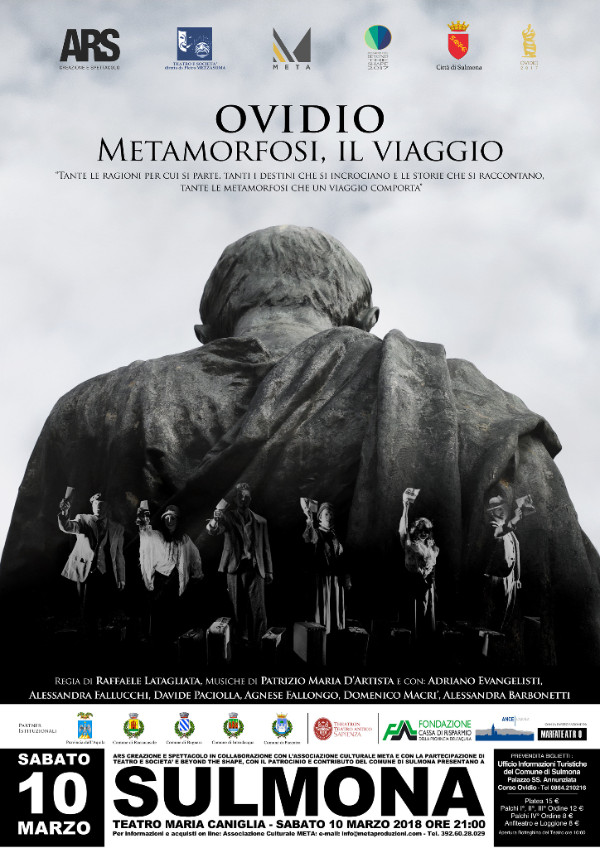Uno spettacolo realizzato in occasione del Bimillenario Ovidiano dall’associazione di produzione e promozione culturale Meta in partnership con il Comune di Sulmona, Ars Creazione e Spettacolo di Mantova, Teatro e Società di Roma e con il Comitato Metamorphosis Beyond the shape e la collaborazione, per la data sulmonese di Marfateatro. L’evento è stato riconosciuto di grande interesse per la nostra collettività ed ha ricevuto il Patrocinio della Provincia dell’Aquila, dei comuni di Bugnara, Pacentro, Introdacqua e Roccacasale oltre che al prestigioso riconoscimento pervenuto anche del progetto “Theatron Teatro antico alla Sapienza”, promosso dall’università la Sapienza di Roma. Questa nuova produzione, diretta da Raffaele Latagliata e che si avvale della partecipazione di 6 attori professionisti – Adriano Evangelisti, Alessandra Fallucchi, Davide Paciolla, Agnese Fallongo e Alessandra Barbonetti, Domenico Macrì – , intende celebrare la figura del poeta Ovidio attraverso una rielaborazione di alcune parti dell’opera “Metamorphoseon” adattandole ad una storia dalle connotazioni fortemente contemporanee. Questa rilettura del testo originale conferisce alla rappresentazione l’opportunità di contestualizzare l’opera di Ovidio in una visione moderna che ne facilita la fruizione.Le musiche originali sono firmate dal compositore sulmonese Patrizio Maria D’Artista che, dopo il successo riscosso con il primo musical dedicato allo Zecchino d’Oro e il grande riscontro di pubblico ottenuto con la data sulmonese, andata in scena al Teatro Maria Caniglia lo scorso dicembre, torna a farsi promotore di eventi dedicati al suo territorio.