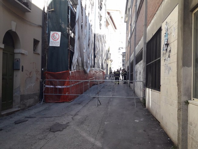 Palazzo pericolante a Teramo: chiuse al traffico per motivi di sicurezza Via Muzi e Vico del Cigno a seguito del sopralluogo effettuato dai Vigili del Fuoco.