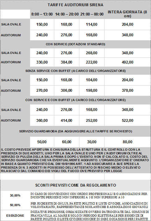 Ad un mese dall’apertura, Palazzo Sirena fa registrare una serie di successi in ambito culturale. Teatro e musica sono state due grandi protagoniste di questo primo mese della stagione del rinnovato auditorium, inaugurato poco prima di Natale con un programma di appuntamenti che andranno avanti sino alla primavera inoltrata. Ma gli spettacoli non sono l’unica dimensione che il prestigioso contenitore del palazzo Sirena può ospitare. L’Auditorium, con i suoi 274 posti, è in grado di portare in scena anche congressi e convegni e a tal proposito l’Amministrazione Luciani ha deliberato (delibera 346/2017) il tariffario per l’affitto della struttura, secondo varie modalità e diversificato nei servizi. La tabella completa è riportata di seguito, ma osservando nel dettaglio dei servizi disponibili si parte dall’affitto della Sala Ovale, piano terra e foyer dell’Auditorium, a quello dell’Auditorium, sino all’affitto di tutta la struttura. Distribuite anche le fasce orarie, in base alle quali è possibile occupare la struttura per l’intera giornata, solo al mattino, solo al pomeriggio o solo in serata. I costi prevedono apertura e chiusura della struttura ed il controllo con la presenza di due addetti, uno per la Sala Ovale e uno per l’Auditorium oltre al servizio di pulizia della sala prima e dopo l’evento. Prevista anche scontistica per ordini professionali, associazioni, gruppi politici e scuole, come descritto dal regolamento comunale vigente per l’utilizzo degli spazi comunali. In particolare, in caso di convenzioni con ordini professionali e/o associazioni per incontri periodici non inferiori a 3 e non superiori a 10 lo sconto sulla tariffa è del 30 per cento, 50 per cento in meno per richieste di onlus, partiti politici, associazioni di volontariato, rappresentanze scolastiche e associazioni giovanili. Esenti dal pagamento le iniziative promosse o patrocinate dal Comune di Francavilla, e solo in periodo elettorale per esigenze di partiti politici o liste civiche, nonché in ogni occasione per i partiti politici.