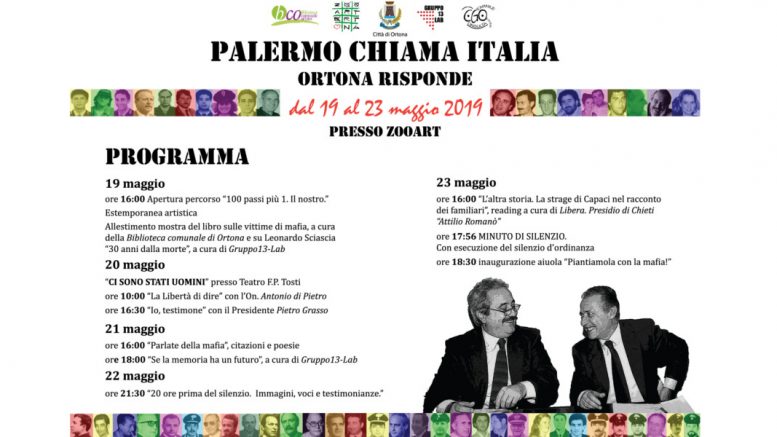 Gli organizzatori spiegano che “Il 23 maggio del 1992 ricorre l’anniversario della strage di Capaci, il tragico attentato in cui sono stati uccisi Giovanni Falcone, la moglie Francesca Morvillo e gli agenti della scorta del magistrato siciliano. Ortona si unisce a Palermo, insieme a tante altre città italiane, in un percorso di sensibilizzazione e conoscenza verso i valori della legalità e dell’antimafia. Tutti gli altri appuntamenti si svolgeranno nella cornice di ZooArt (sotto la passeggiata Orientale), dove il 19 maggio, oltre all’inaugurazione della cinque giorni stessa, verrà presentata l’estemporanea artistica “100 passi più1. Il nostro” insieme all’allestimento della mostra sulle vittime di mafia a cura della Biblioteca Comunale di Ortona e dell’associazione Gruppo13 Lab.