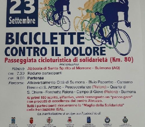 Da anni è impegnata nella ricerca contro il dolore e proprio alla Fondazione Isal sarà dedicata la manifestazione “Biciclette contro il dolore” in programma sabato 23 settembre a Sulmona. Si tratta di una manifestazione non competitiva di circa 80 chilometri, alla quale potranno partecipare tutti, con ogni tipo di bicicletta, anche con le eco bike. Tra i testimonial di eccezione ci saranno gli ex campioni di ciclismo Vittorio Adorni, Francesco Moser, Palmiro Masciarelli, Maurizio Formichetti e Stefano Giuliani.
