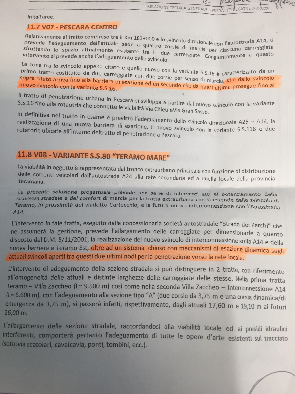 Nei giorni scorsi il duro botta e risposta con il Presidente della Regione D’Alfonso che aveva categoricamente smentito, ma oggi nuovi documenti, inequivocabili, che da una parte confermano l’intenzione di Strada dei Parchi di dar vita ad un mega progetto di riqualificazione, da 5 miliardi di euro, già presentato al Ministero, per il cui finanziamento si prevede anche l’acquisizione dall’Anas della gestione dell’Asse Attrezzato che da Pescara arriva al casello dell’A25 e della Teramo Mare e la relativa realizzazione di (cita testualmente il progetto a pagina 64) barriere di esazione dinamica