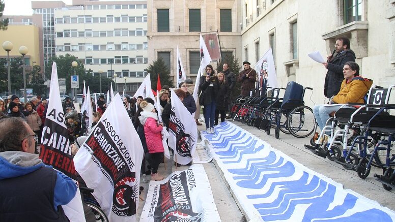 “L’8 febbraio 2019, in seguito all’ennesima menzogna del governo di aumentare le pensioni di invalidità, con lo slogan “disabili ma non cretini” l’associazione Carrozzine determinate con una manifestazione davanti alla Prefettura di Pescara, ha ricordato alla stessa politica come abbia dimenticato e abbandonato al proprio destino le persone con disabilità e le loro famiglie, costringendole a continuare a sopravvivere con una pensione di soli 285,66 euro mensili, il 300% al di sotto della soglia di povertà.
