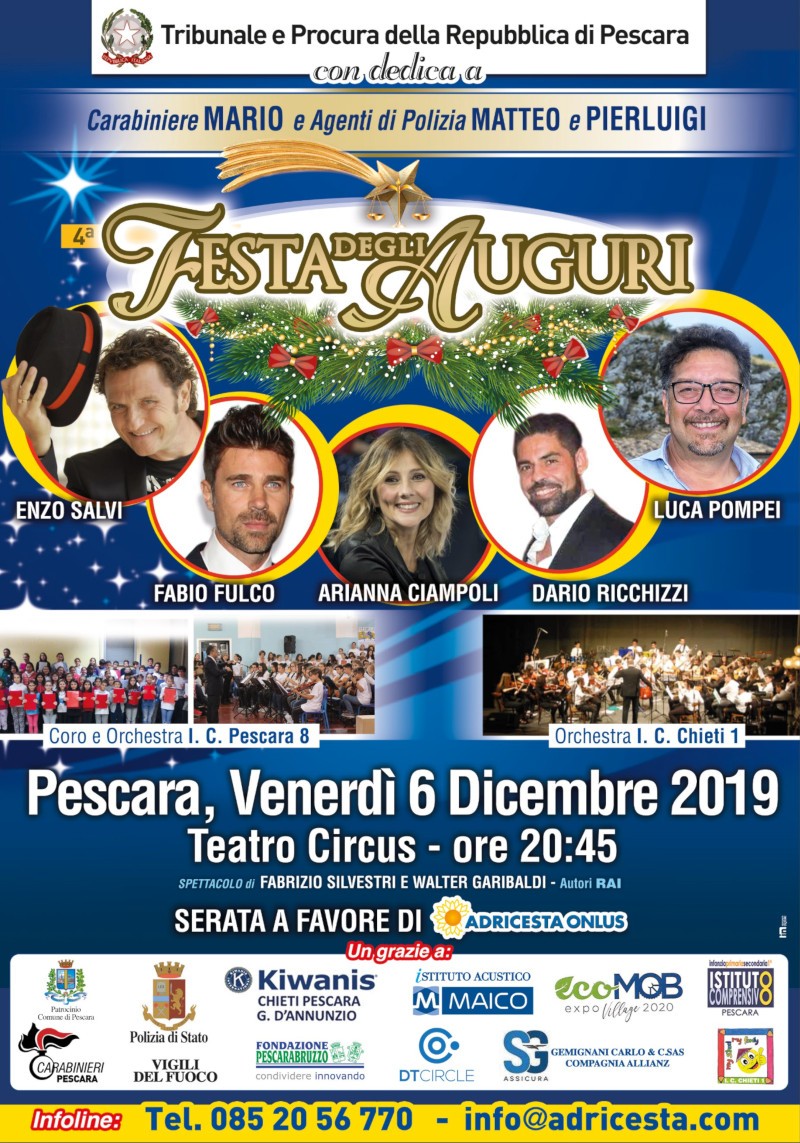L’edizione di quest’anno è dedicata alla memoria di Mario Ciercello Rega, il carabiniere ucciso nei mesi scorsi a Roma, e di PIERLUIGI Ratta e Matteo Demenego, gli agenti di Polizia uccisi all’interno della Questura di Trieste. Lo spettacolo diretto da Fabrizio Silvestri e WALTER Garibaldi (autori Rai) vedrà la partecipazione dell’attore Fabio Fulco, del comico Enzo Salvi, del tenore Dario Ricchizzi e l’esibizione del coro e dell’orchestra dell’Istituto Comprensivo 8 di Pescara e dell’orchestra dell’Istituto Comprensivo 1 di Chieti. La serata sarà condotta da Arianna Ciampoli e Luca Pompei ed il ricavato sarà devoluto ai progetti dell’Adricesta Onlus.
