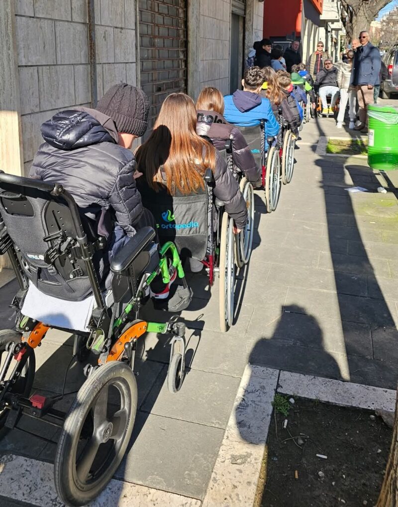 Dopo essere stati a lezione di felicità, empatia, disabilità e diritti con il presidente dell’Associazione “Carrozzine Determinate” Claudio Ferrante gli studenti si sono cimentati anche nella passeggiata empatica in carrozzina per le vie di Pescara scoprendosi improvvisamente prigionieri della propria città.