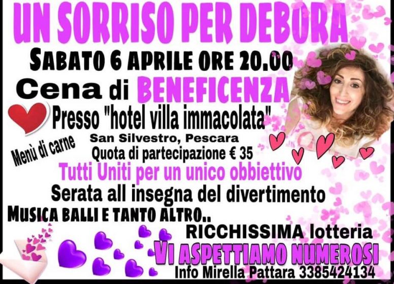 Sabato 6 Aprile alle 20:00 all’hotel “Villa Immacolata” San Silvestro, si terrà una cena di beneficenza denominata “Un Sorriso Per Debora”.