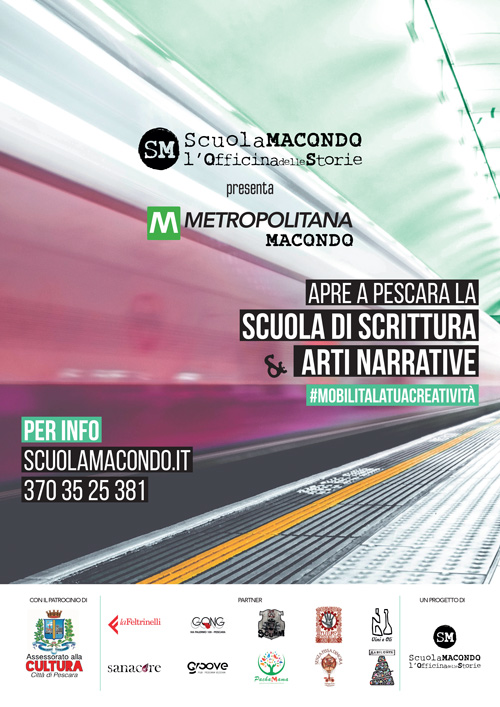 Si chiama Metropolitana Macondo ed è il nuovo progetto della Scuola Macondo – l’Officina delle Storie dell’autore Peppe Millanta e della Psicodrammatista Valentina Bonaccio: una scuola di scrittura e arti narrative che invaderà il centro di Pescara, sfruttando dei luoghi non convenzionali come fossero stazioni di un unico tracciato. L’obiettivo è infatti quello di collegare idealmente alcuni dei punti di aggregazione giovanile e di cultura più importanti della città attraverso l’arte e il suo insegnamento. Oltre 14 laboratori, che si svolgeranno in 10 differenti punti della città, tenuti da oltre 20 professionisti del settore, provenienti dall’Abruzzo e da fuori regione. Scrittura, Sceneggiatura, Drammaturgia, Corsi specifici per ragazzi di elementari, medie e superiori, Psicodramma, Disegno, Songwriting, Educazione all’ascolto sono solo alcuni dei corsi cui si potrà partecipare da novembre a maggio, dal lunedì al giovedì, tutte declinazioni della narrazione, intesa nel senso ampio del termine.