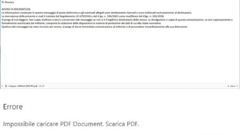 Attenzione quando aprite le e-mail. L’ultimo allert in ordine di tempo arriva dal Comune di Pescara che in una nota spiega che: “Stanno arrivando in queste ore, via mail, dei finti verbali della polizia locale di Pescara, inviati da un indirizzo pec della Provincia di Pescara: [email protected] e il messaggio contiene un allegato il cui nome è ‘verbale sinistro.pdf’. Cercando di aprire il file si scopre che il presunto verbale è impossibile da scaricare”.