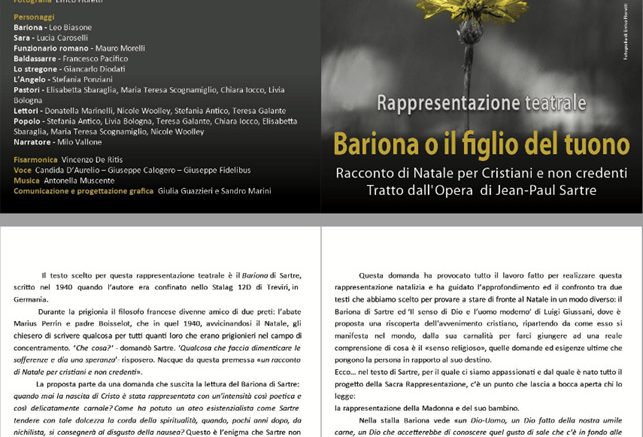 Da un’idea del docente dell’Università “G.d’Annunzio” Giuseppe Fidelibus, con la regia e l’adattamento di Milo Vallone, la neonata compagnia “Attori per caso” mette in scena “Bariona o figlio del tuono. Racconto di Natale per cristiani e non credenti”, domani sera alle 21.00 alla Sala Consiliare del Comune di Pescara. Tratto dal testo di Jean Paul Sartre del 1940, scritto in un campo di concentramento, uno delle migliori espressioni della Natività, da parte, per altro, di un ateo, “Bariona” arriva in teatro dopo la versione cinematografica, dal titolo “Anno Zero”, dello stesso Milo Vallone che dopo i tanti riconoscimenti in giro per l’Italia e all’estero, si cimenta nell’affascinante sfida di far recitare una compagnia non di attori, ma di appassionati allo straordinario messaggio di speranza che traspare da questo testo: