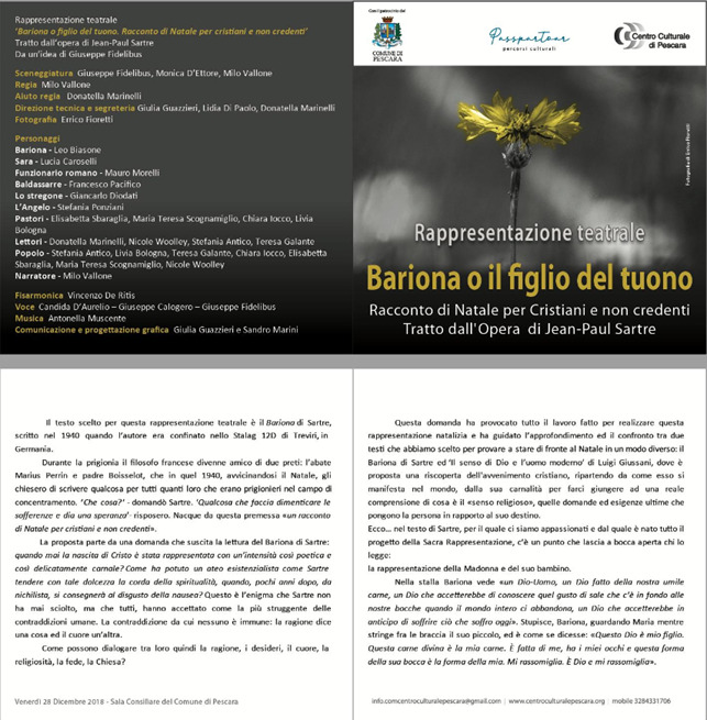 Da un’idea del docente dell’Università “G.d’Annunzio” Giuseppe Fidelibus, con la regia e l’adattamento di Milo Vallone, la neonata compagnia “Attori per caso” mette in scena “Bariona o figlio del tuono. Racconto di Natale per cristiani e non credenti”, domani sera alle 21.00 alla Sala Consiliare del Comune di Pescara. Tratto dal testo di Jean Paul Sartre del 1940, scritto in un campo di concentramento, uno delle migliori espressioni della Natività, da parte, per altro, di un ateo, “Bariona” arriva in teatro dopo la versione cinematografica, dal titolo “Anno Zero”, dello stesso Milo Vallone che dopo i tanti riconoscimenti in giro per l’Italia e all’estero, si cimenta nell’affascinante sfida di far recitare una compagnia non di attori, ma di appassionati allo straordinario messaggio di speranza che traspare da questo testo: