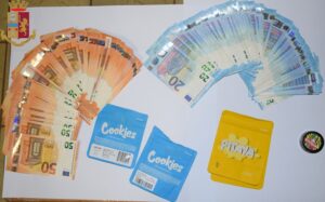 Sono stati sequestrati ulteriori 50 grammi di marijuana già confezionata in dosi, 750 grammi di hashish confezionati in panetti e 5 sigari contenenti cannabis, i cosidetti “cannagars”, sigari fatti interamente di cannabis oppure ripieni di marijuana e poi cosparsi con olio di resina di cannabis oltre ad altri 550 sigari destinati alla realizzazione di ulteriori “cannagars”. E’ stato sequestrato anche materiale per il confezionamento delle dosi di stupefacente e sei mila euro in contanti.