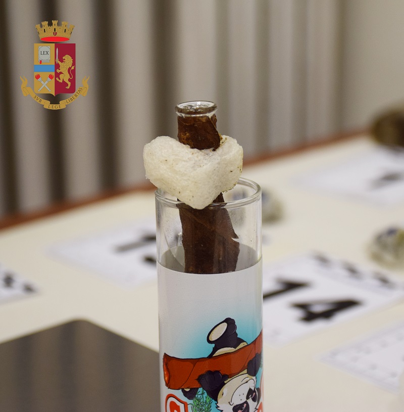 Sono stati sequestrati ulteriori 50 grammi di marijuana già confezionata in dosi, 750 grammi di hashish confezionati in panetti e 5 sigari contenenti cannabis, i cosidetti “cannagars”, sigari fatti interamente di cannabis oppure ripieni di marijuana e poi cosparsi con olio di resina di cannabis oltre ad altri 550 sigari destinati alla realizzazione di ulteriori “cannagars”. E’ stato sequestrato anche materiale per il confezionamento delle dosi di stupefacente e sei mila euro in contanti.