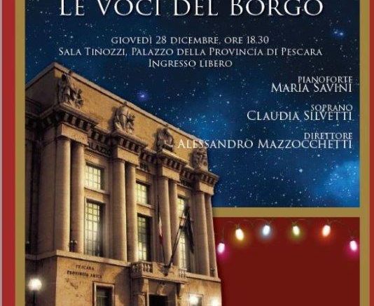 Per il secondo anno il coro polifonico “Le Voci del Borgo” offre alla città di Pescara un concerto di canti natalizi e canti sacri dal 500 ai giorni nostri. L’evento, avrà inizio alle 18,30 ed è organizzato in collaborazione con la Presidenza della Provincia. Il complesso di voci, diretto dal M° Alessandro Mazzocchetti, sarà accompagnato da Maria Savini al pianoforte e dalla voce solista di Claudia Silvetti, soprano. Il programma del concerto comprende autori classici , canti profani e armonizzazioni di canti tradizionali natalizi.